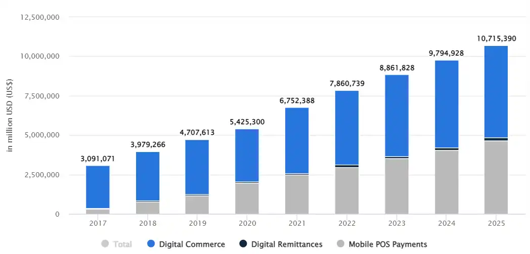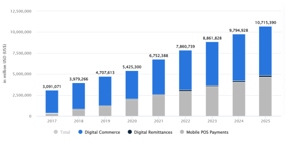 Figure 2: evolution of the transaction value in the digital payments sector ranging from 2017 up to 2025 (2022-2025 being a forecast)^2