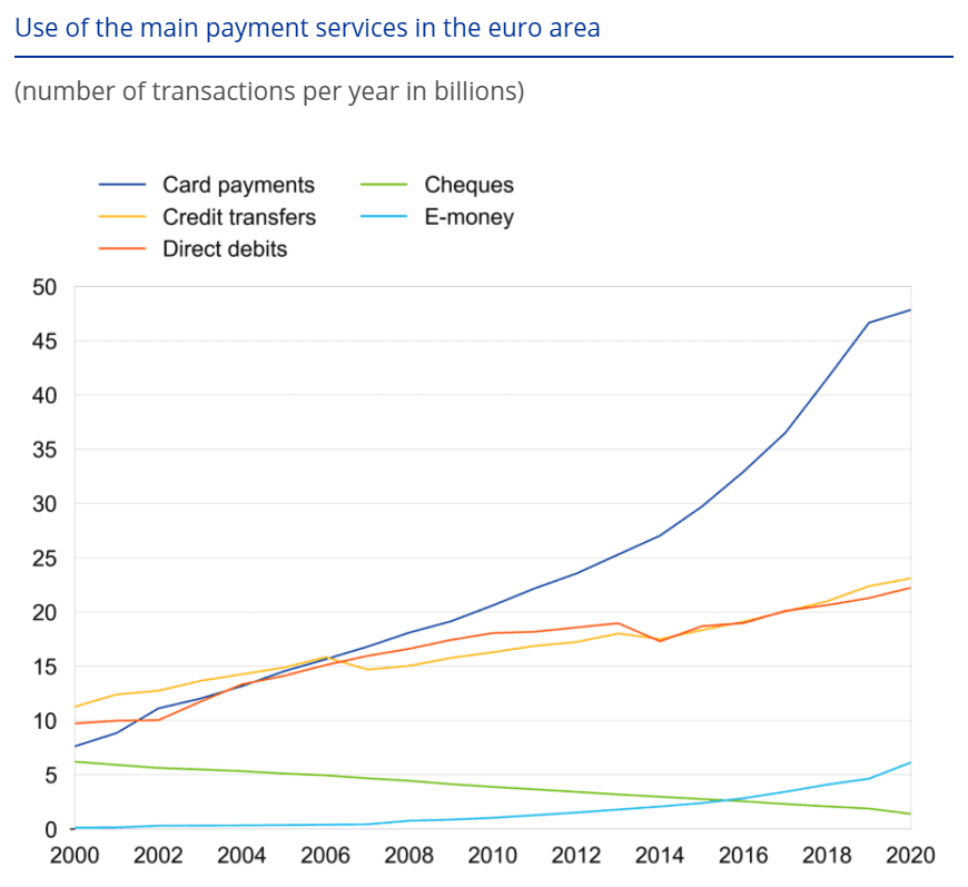 Figure 1: evolution of the number of transactions across payment methods ranging from 2000 up to 2020^1