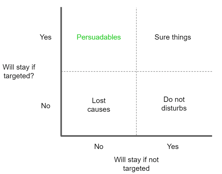 The goal of uplift modeling is to predict which of the customers belong to the persuadables group as targeting this group will bring the most added value for the business. This group, if targeted, will stay and will continue to bring in revenue.