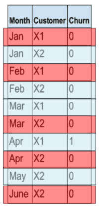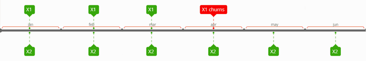 Let’s take a simple example of a business with two clients, namely X1 and X2 and six months of data. Let’s also, to simplify, agree that we want to predict the moment of churn itself. In practice, we would like to predict churn a few months in advance so that the business still would have time to target the customer with a retention campaign. We could then model this as a batch process that will check each month which customer will churn in the next three months. However, this solution would not be optimal for a real-time or next-best-action type of model (and is out of scope for this post).