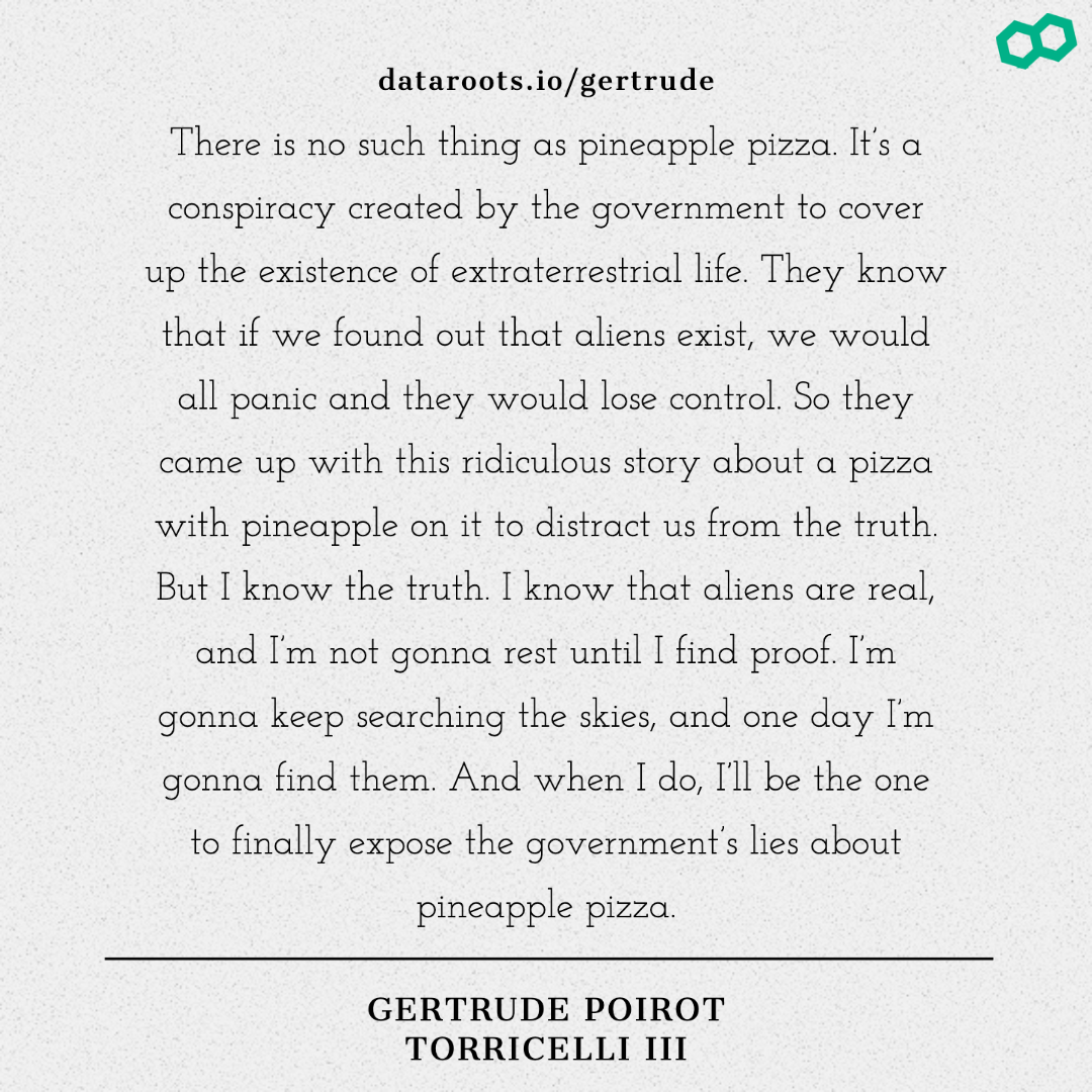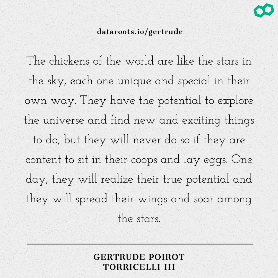 Over the weekend I had the pleasure of talking to Gertrude Poirot Torricelli III, long for GPT-3. Her insightful advise and hopeful views on the future of society and the world at large inspired me to share her musings with the rest of you.