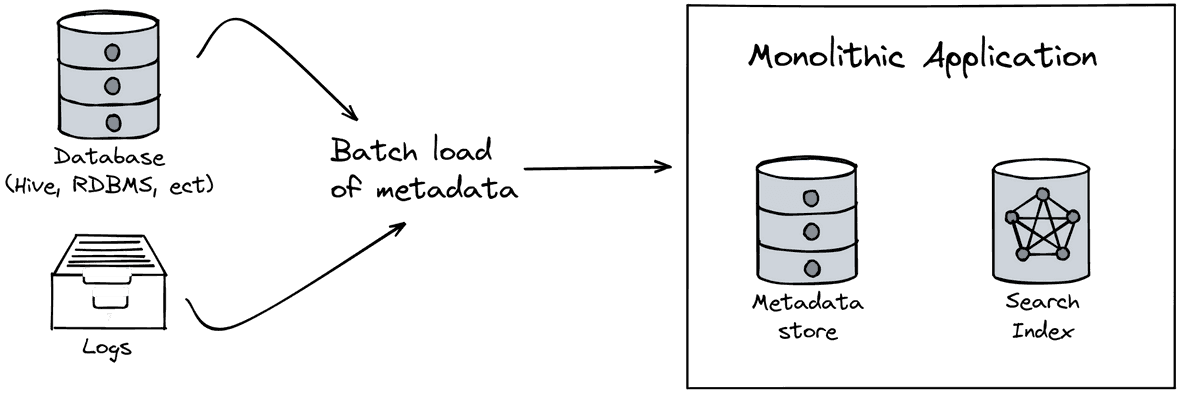 The first-generation metadata hub consists of a monolithic application connected to a primary metadata store. Sometimes the metadata stored in the primary store is duplicated to be used as a search index. In practice, metadata is imported from your different data sources or ETL logs using an orchestrator such as Airflow.