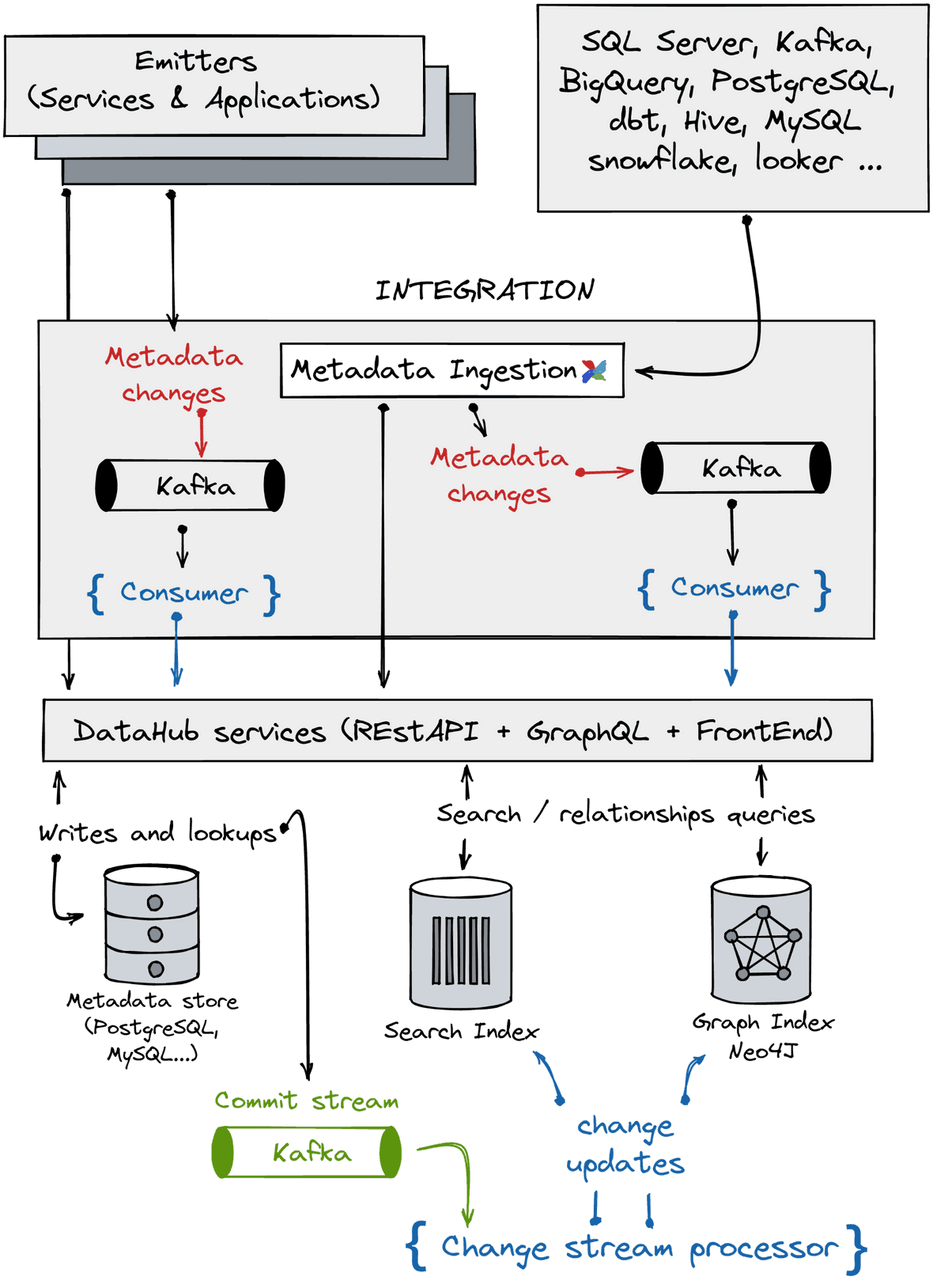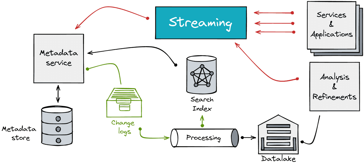 One major advantage of theses systems is their ability to capture and process metadata changes. Any changes made to your data sources or jobs generate some metadata change logs. These are pushed/committed into the appropriate metadata services to be processed. Changes are then applied to the corresponding metadata stores or indexes. The ability to process and update changes is the major evolution provided by this type of metadata hub.