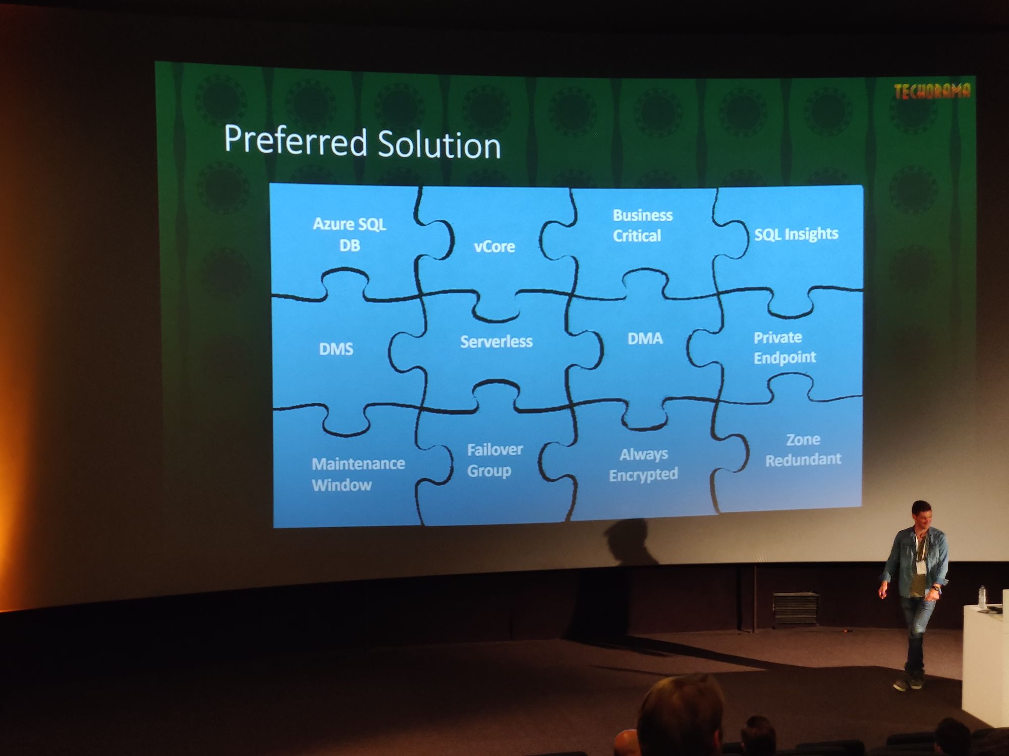 Without any doubt my favourite session during the whole conference was the one given by Pieter Vanhove. He turned the session into a mini-workshop where attendees were divided into small groups and had to - literally - use pieces of a puzzle to build a solution for a concrete use case. In the use case, a company was planning on migrating their on-premise SQL Server to the cloud and we had to design all aspects of the migration journey.