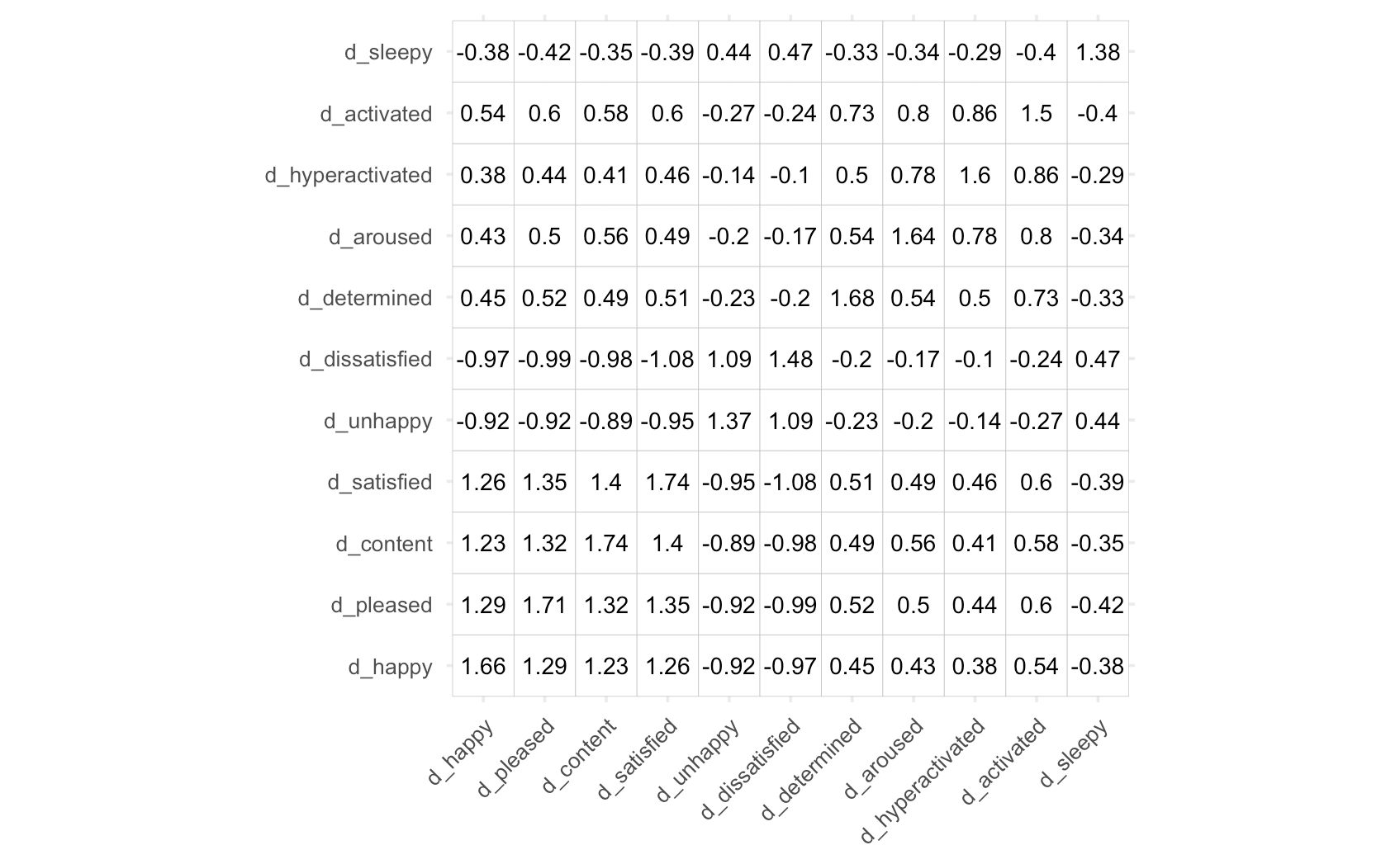 Using the Eckart-Young theorem we can prove that PCA optimally reconstructs the totality of the covariance matrix. As an example, Iet's again look at the covariance matrix of the emotion items used before. I ran both PCA and FA, specifying a 2 component/factor solution. We can then reconstruct a lower rank matrix \( R_{rec} \) and subtract this new matrix from \( R \) to get a matrix of residuals, \( R_{res} \) :